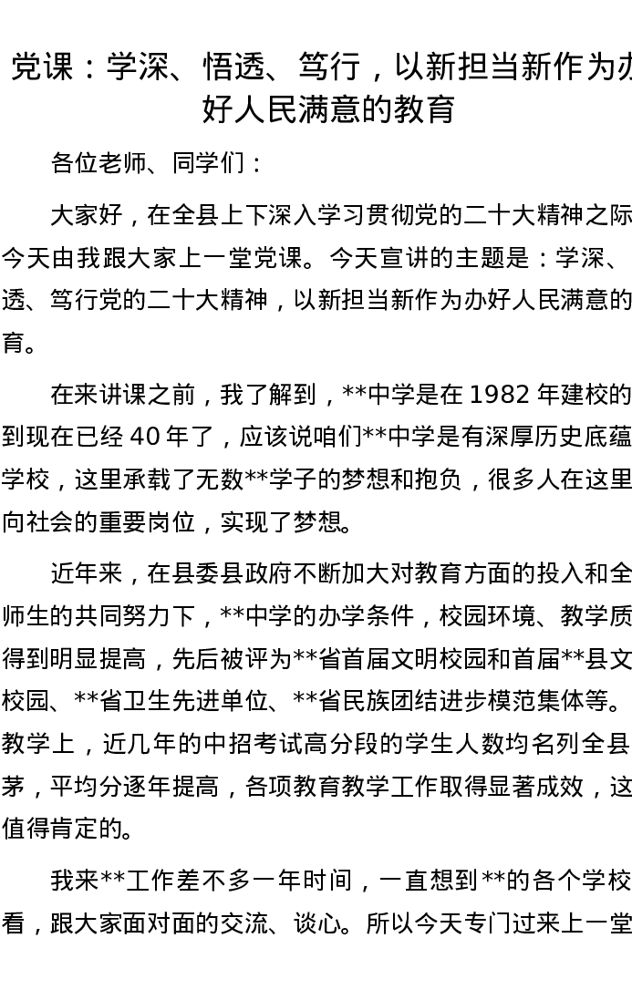 党课:学深、悟透、笃行,以新担当新作为办好人民满意的教育