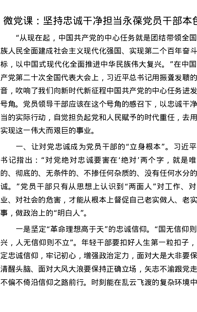 微党课:坚持忠诚干净担当 永葆党员干部本色