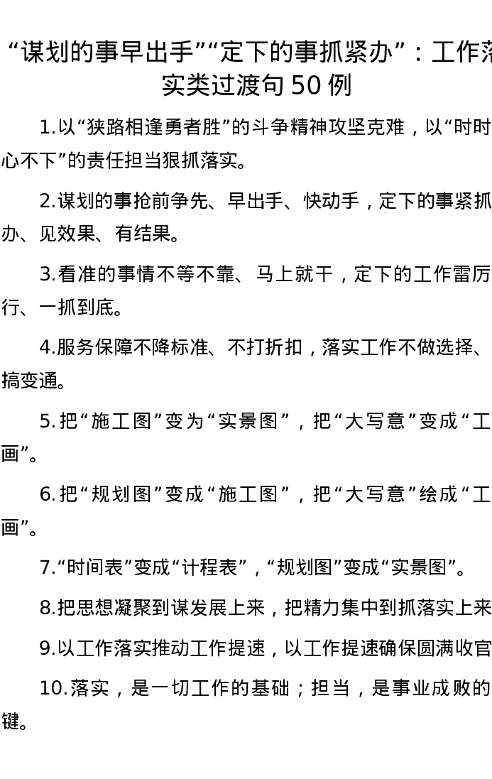 “谋划的事早出手”“定下的事抓紧办”:工作落实类过渡句50例