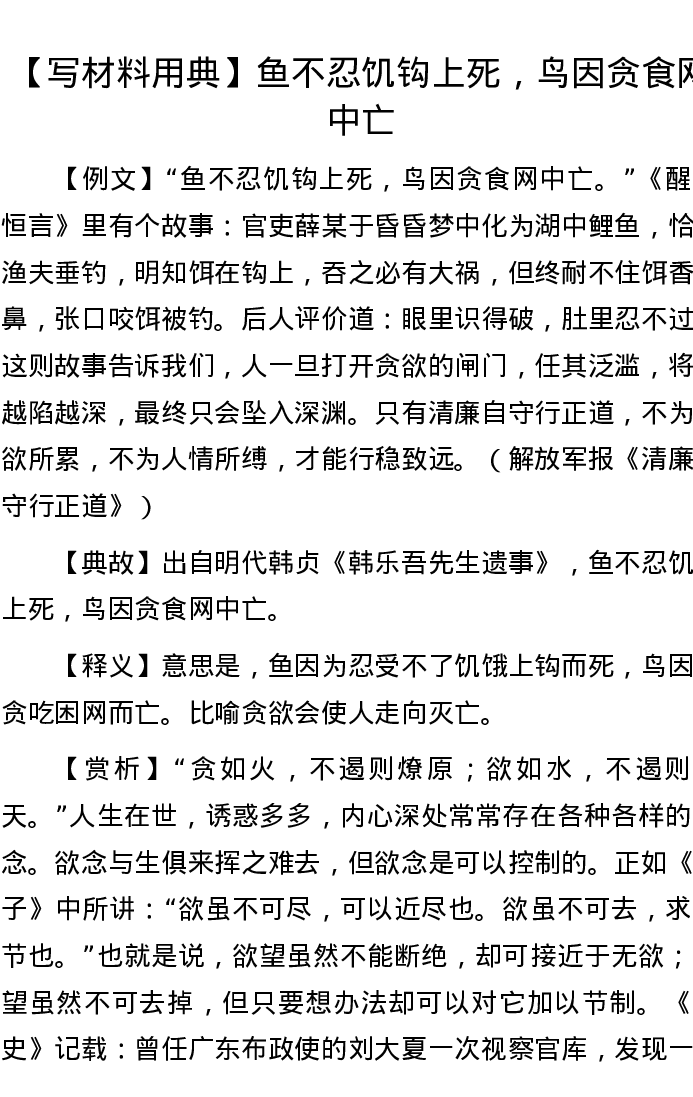 【写材料用典】鱼不忍饥钩上死,鸟因贪食网中亡