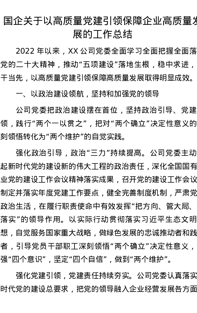 国企关于以高质量党建引领保障企业高质量发展的工作总结