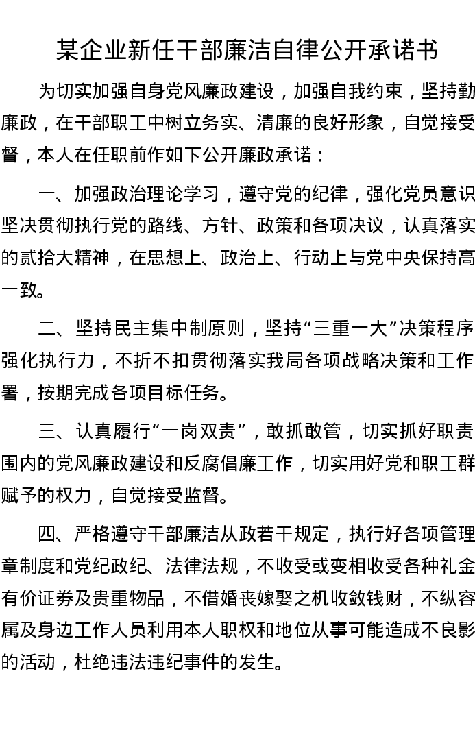 某企业新任干部廉洁自律公开承诺书