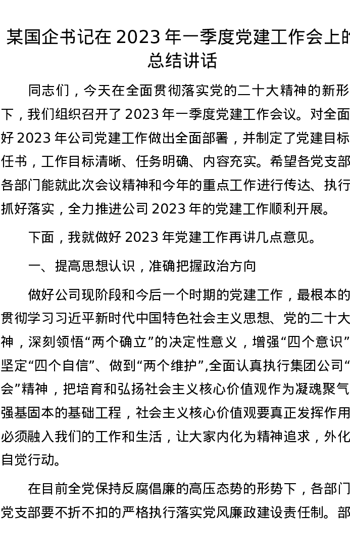某国企书记在2023年一季度党建工作会上的总结讲话