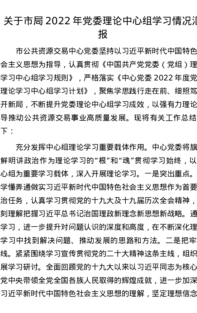 关于市局2022年党委理论中心组学习情况汇报