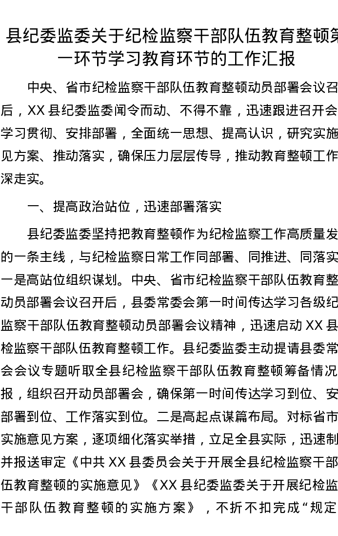 县纪委监委关于纪检监察干部队伍教育整顿第一环节学习教育环节的工作汇报