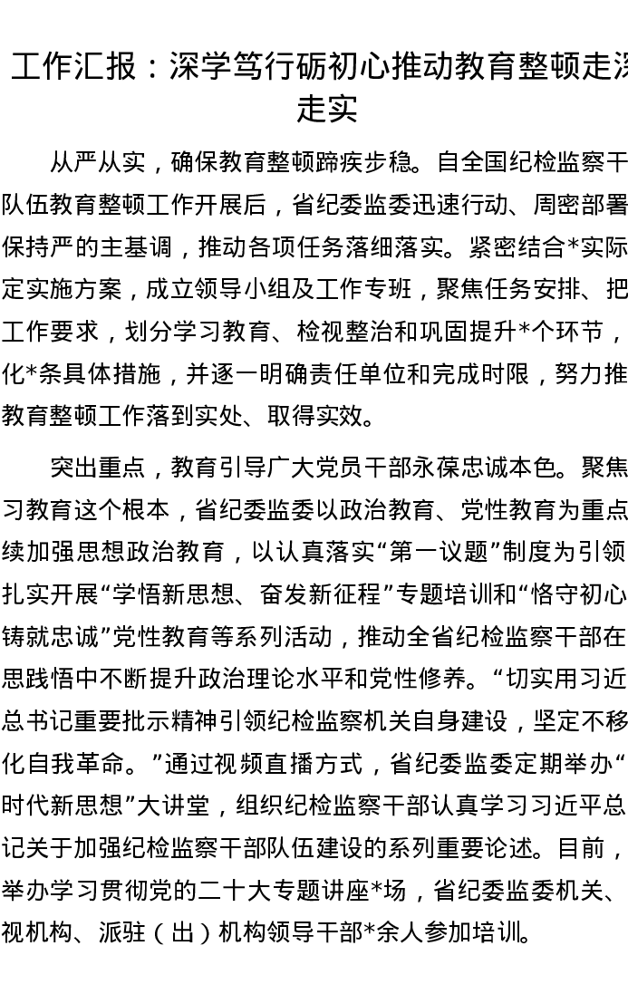 工作汇报:深学笃行砺初心推动教育整顿走深走实