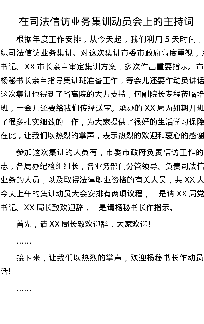 在司法信访业务集训动员会上的主持词