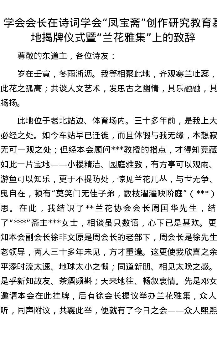 学会会长在诗词学会“凤宝斋”创作研究教育基地揭牌仪式暨“兰花雅集”上的致辞