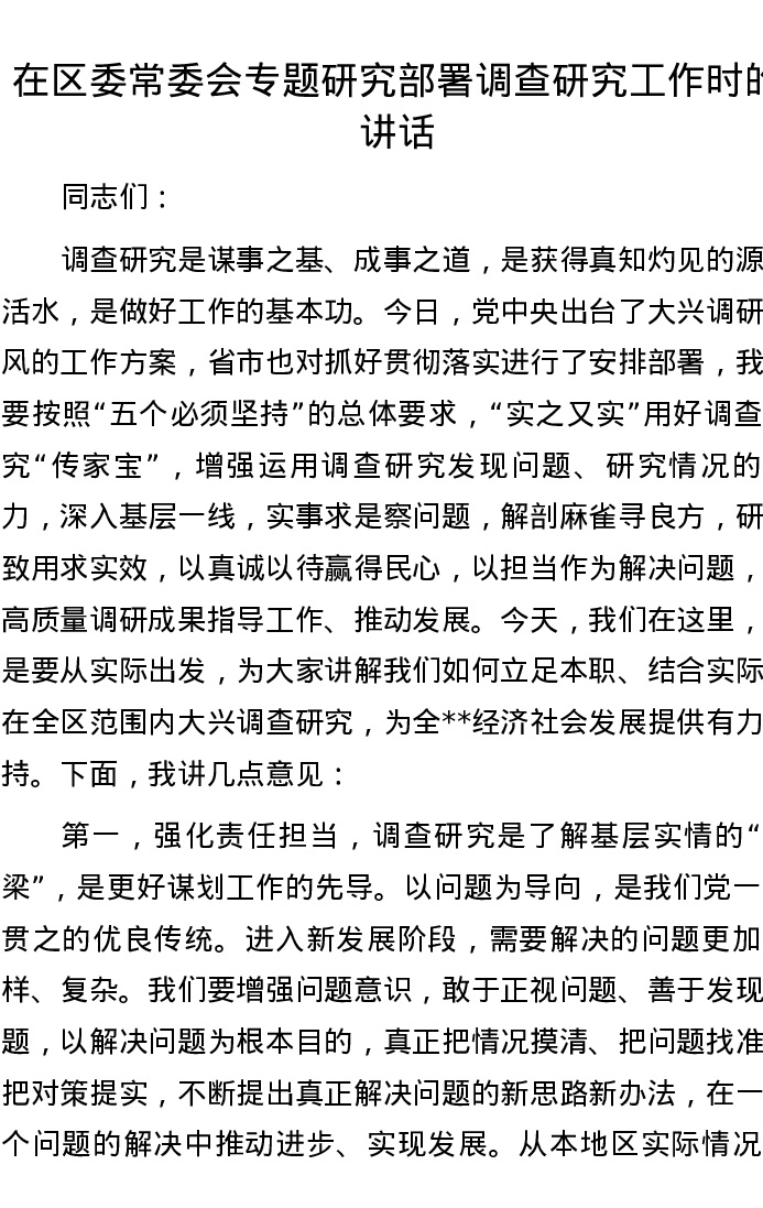 在区委常委会专题研究部署调查研究工作时的讲话