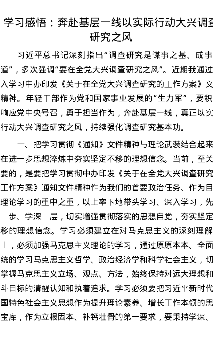 学习感悟: 奔赴基层一线 以实际行动大兴调查研究之风