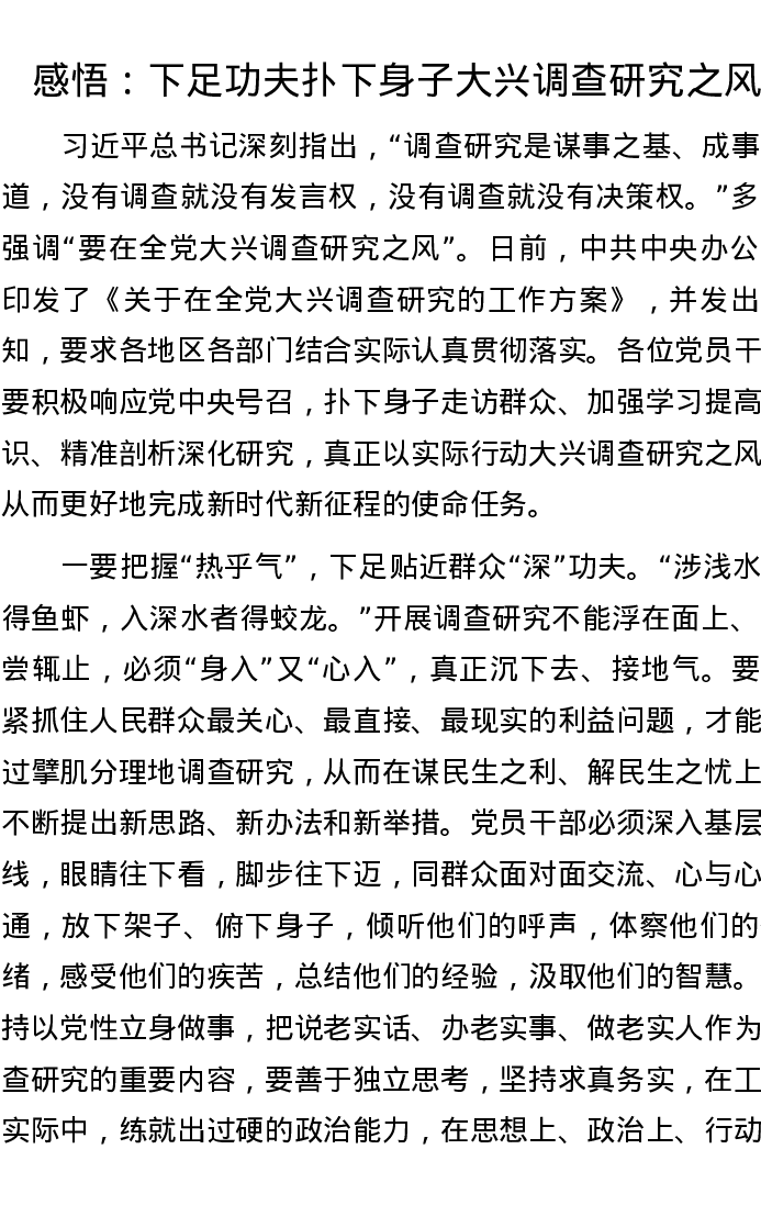 感悟:下足功夫 扑下身子 大兴调查研究之风