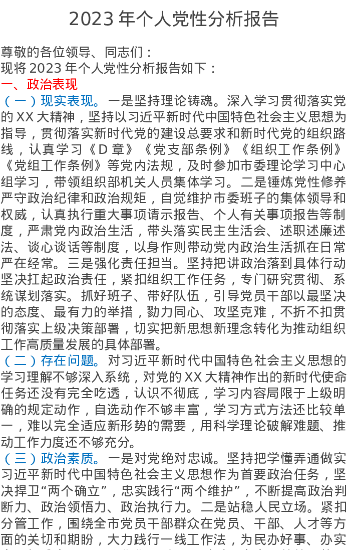 2023年个人党性分析报告