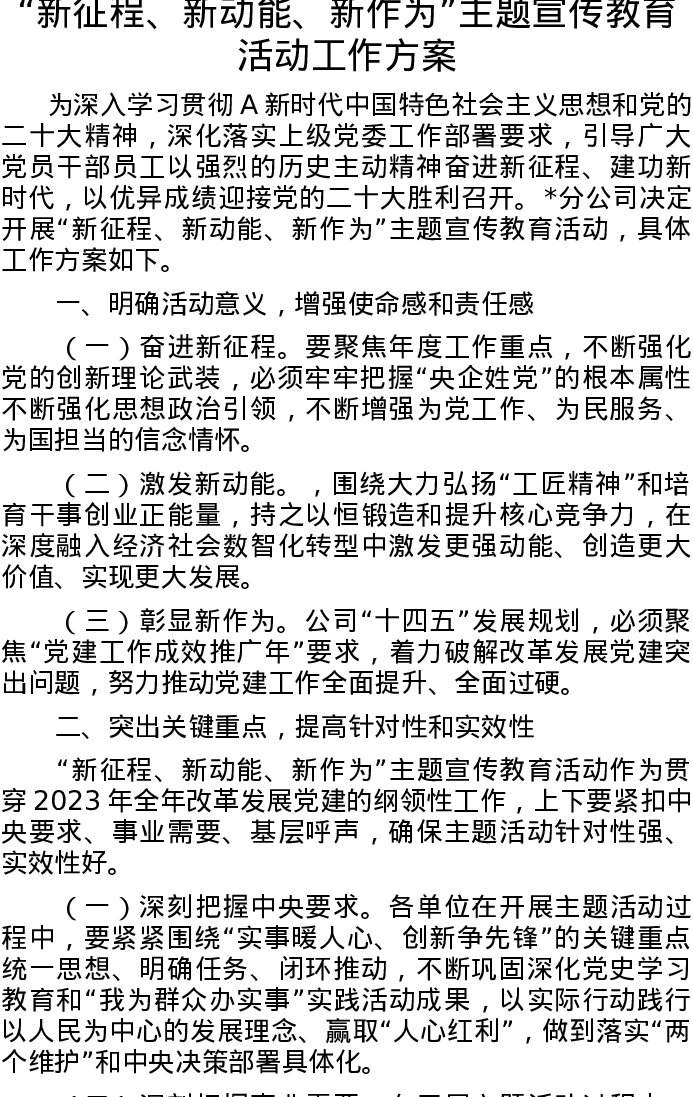 “新征程、新动能、新作为”主题宣传教育活动工作方案