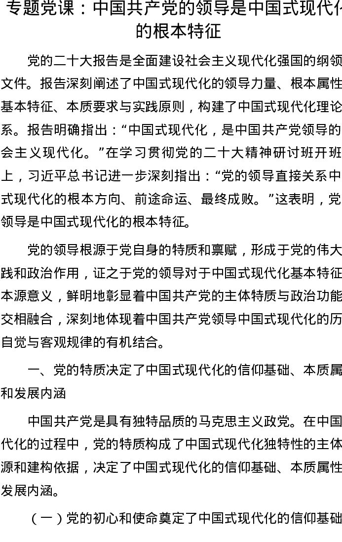 专题党课:中国共产党的领导是中国式现代化的根本特征