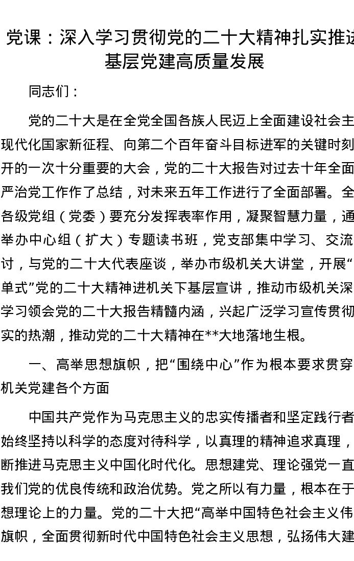 党课:深入学习贯彻党的二十大精神 扎实推进基层党建高质量发展