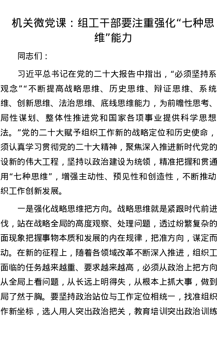 机关微党课:组工干部要注重强化“七种思维”能力
