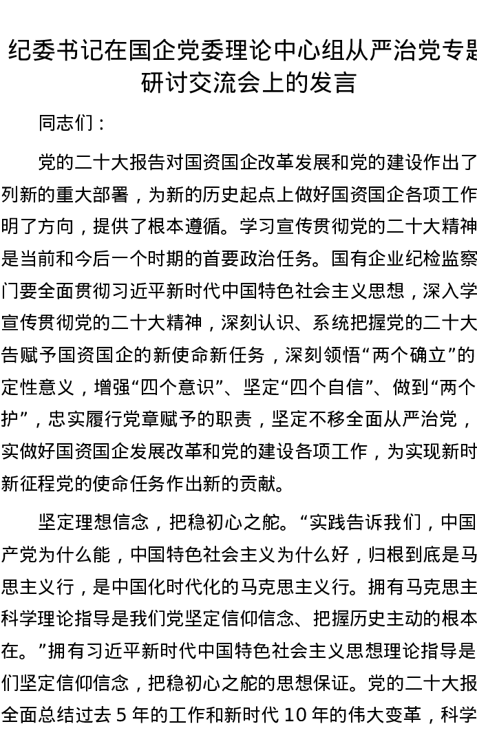 纪委书记在国企党委理论中心组从严治党专题研讨交流会上的发言