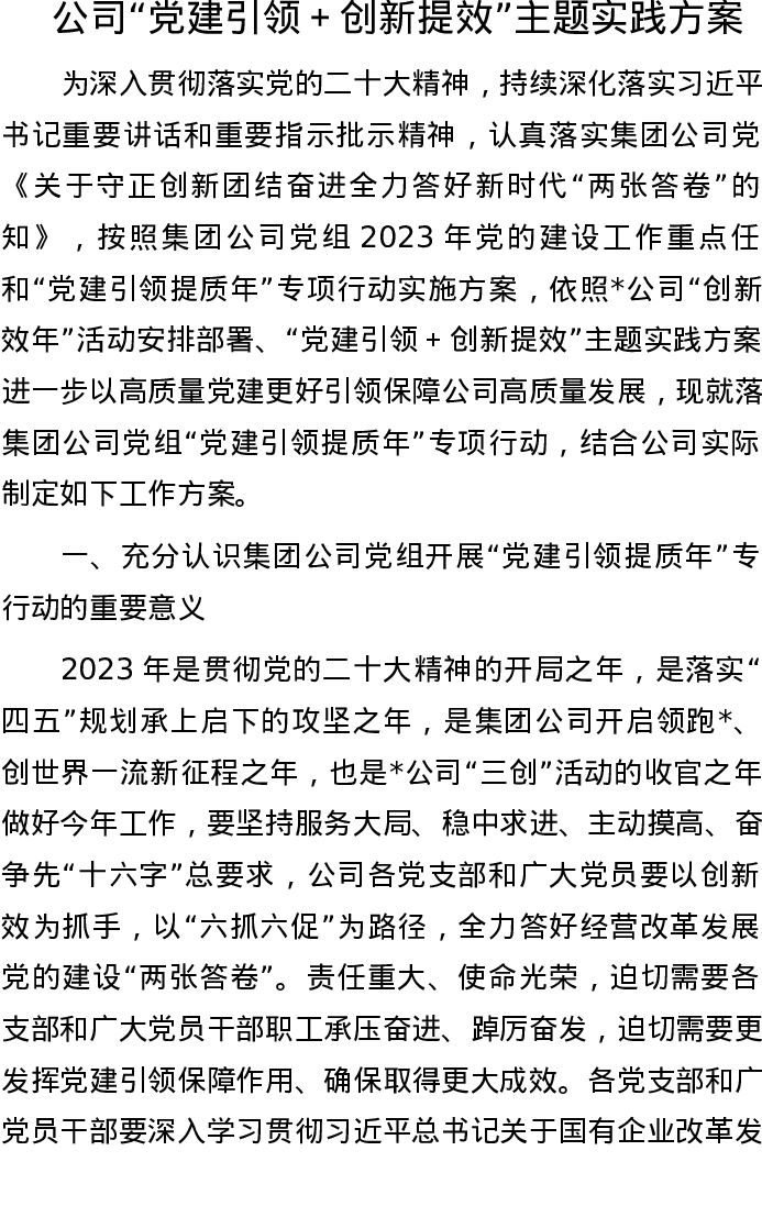 公司“党建引领+创新提效”主题实践方案