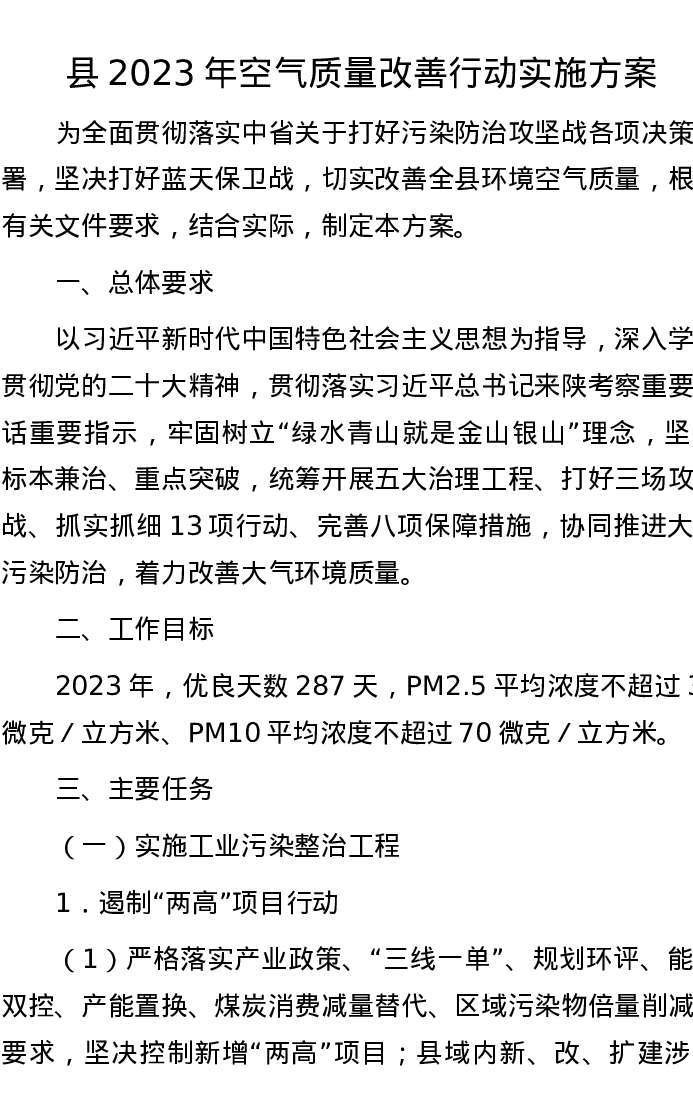 县2023年空气质量改善行动实施方案