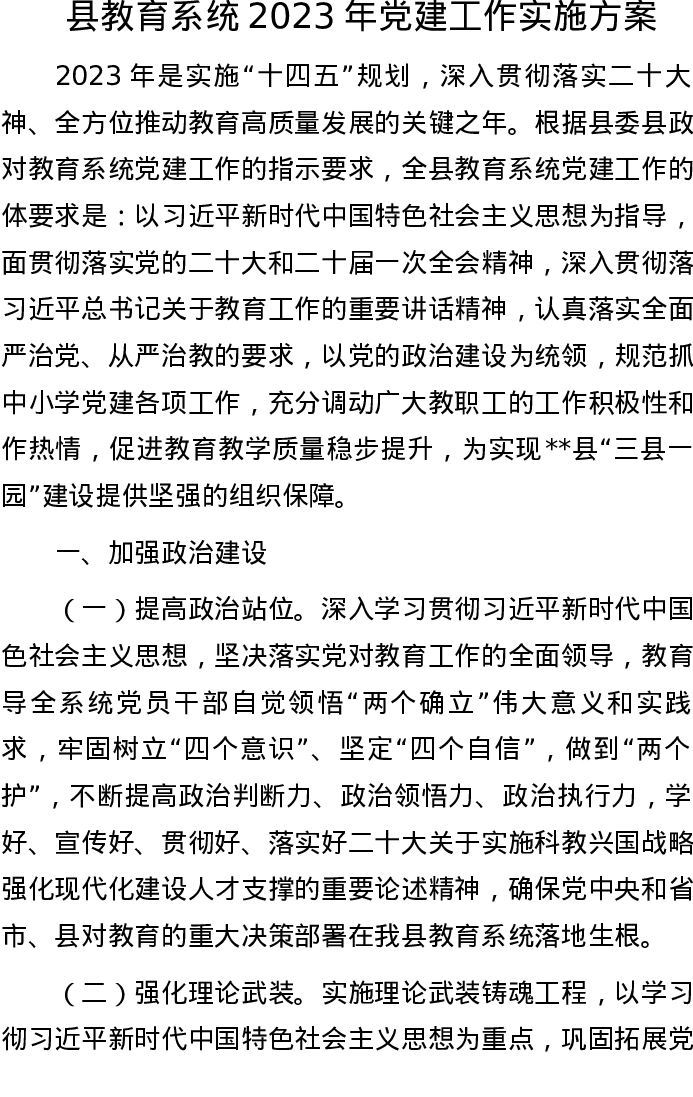 县教育系统2023年党建工作实施方案