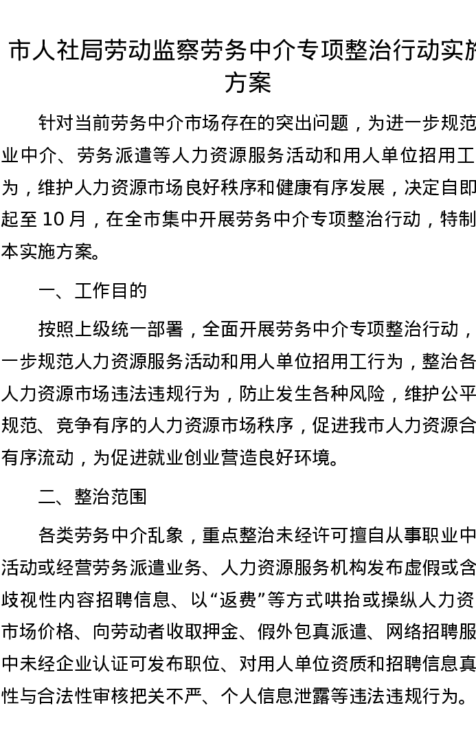 市人社局劳动监察劳务中介专项整治行动实施方案