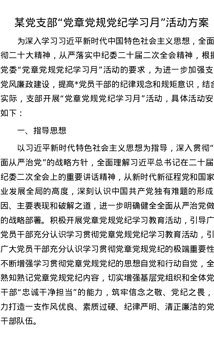 某党支部“党章党规党纪学习月”活动方案