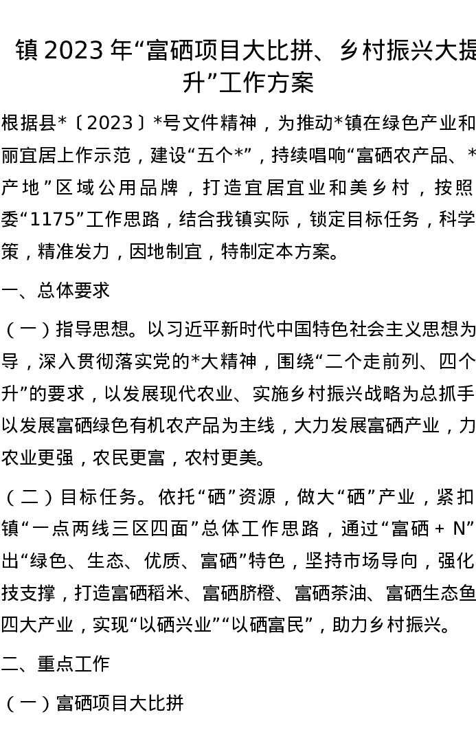 镇2023年“富硒项目大比拼、乡村振兴大提升”工作方案