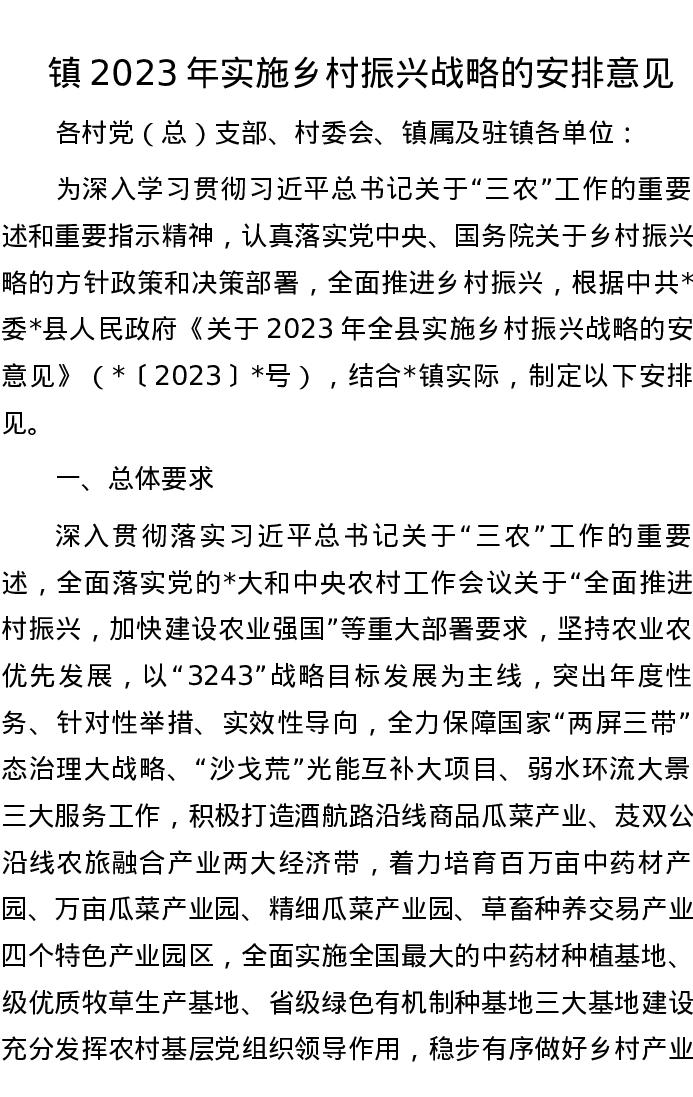 镇2023年实施乡村振兴战略的安排意见