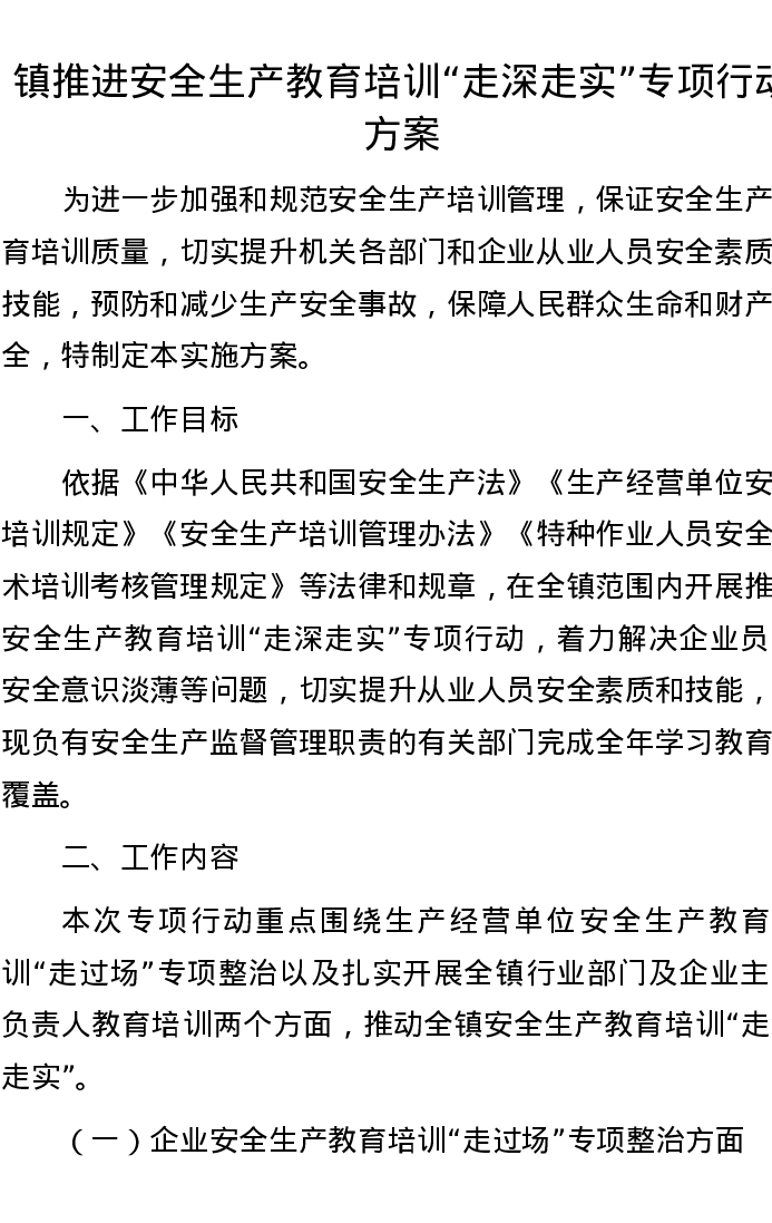 镇推进安全生产教育培训“走深走实”专项行动方案