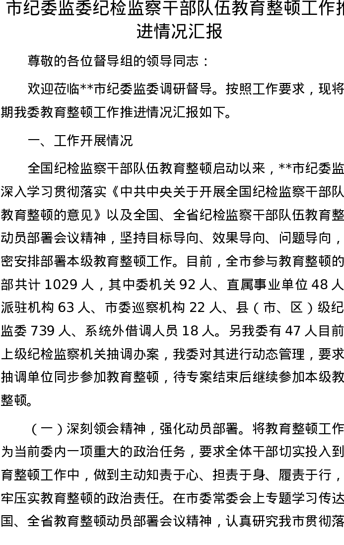 市纪委监委纪检监察干部队伍教育整顿工作推进情况汇报