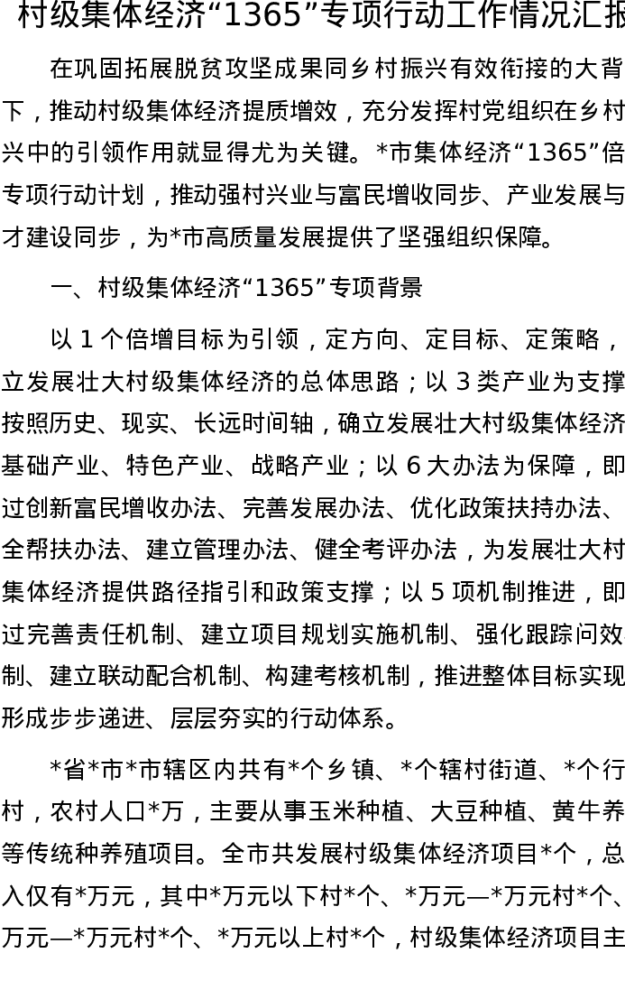 村级集体经济“1365”专项行动工作情况汇报