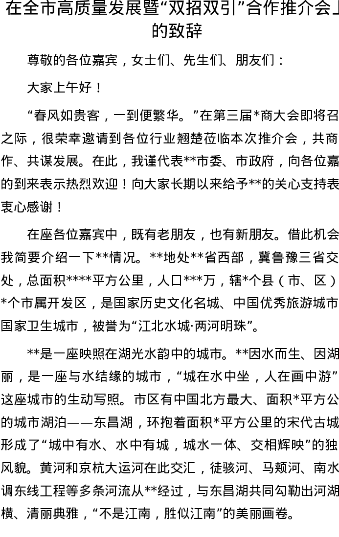 在全市高质量发展暨“双招双引”合作推介会上的致辞