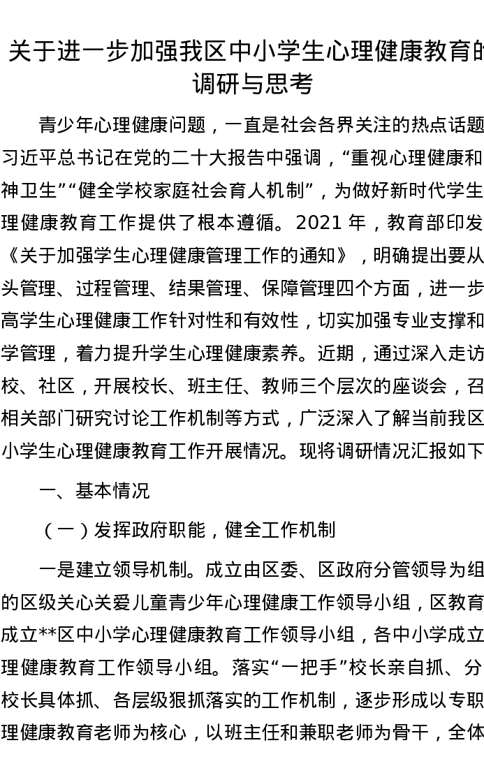 关于进一步加强我区中小学生心理健康教育的调研与思考