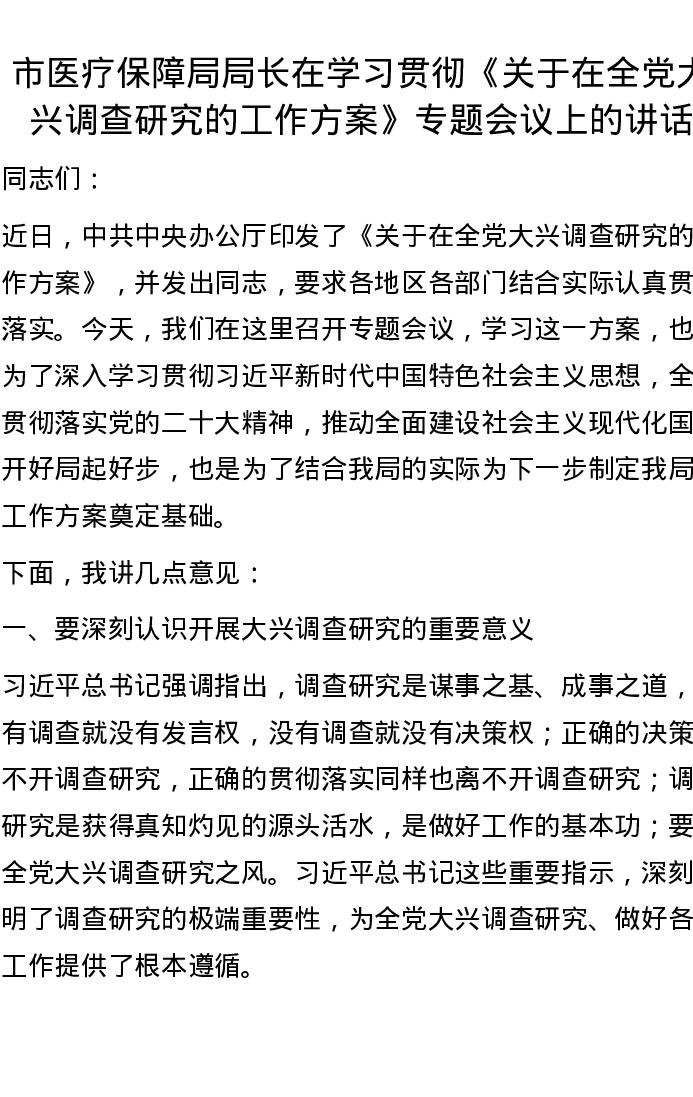 市医疗保障局局长在学习贯彻《关于在全党大兴调查研究的工作方案》专题会议上的讲话