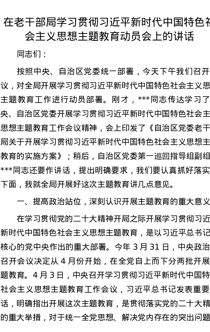 在老干部局学习贯彻新时代中国特色社会主义思想主题教育动员会上的讲话