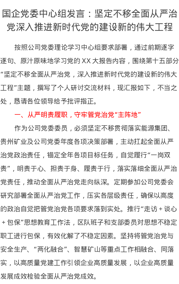 国企党委中心组发言:坚定不移全面从严治党深入推进新时代党的建设新的伟大工程