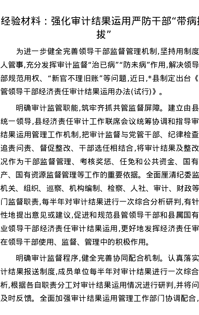 经验材料:强化审计结果运用严防干部“带病提拔”