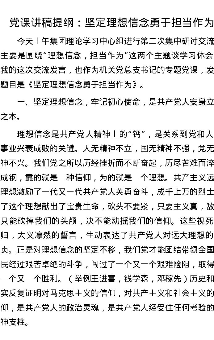 党课讲稿提纲:坚定理想信念 勇于担当作为