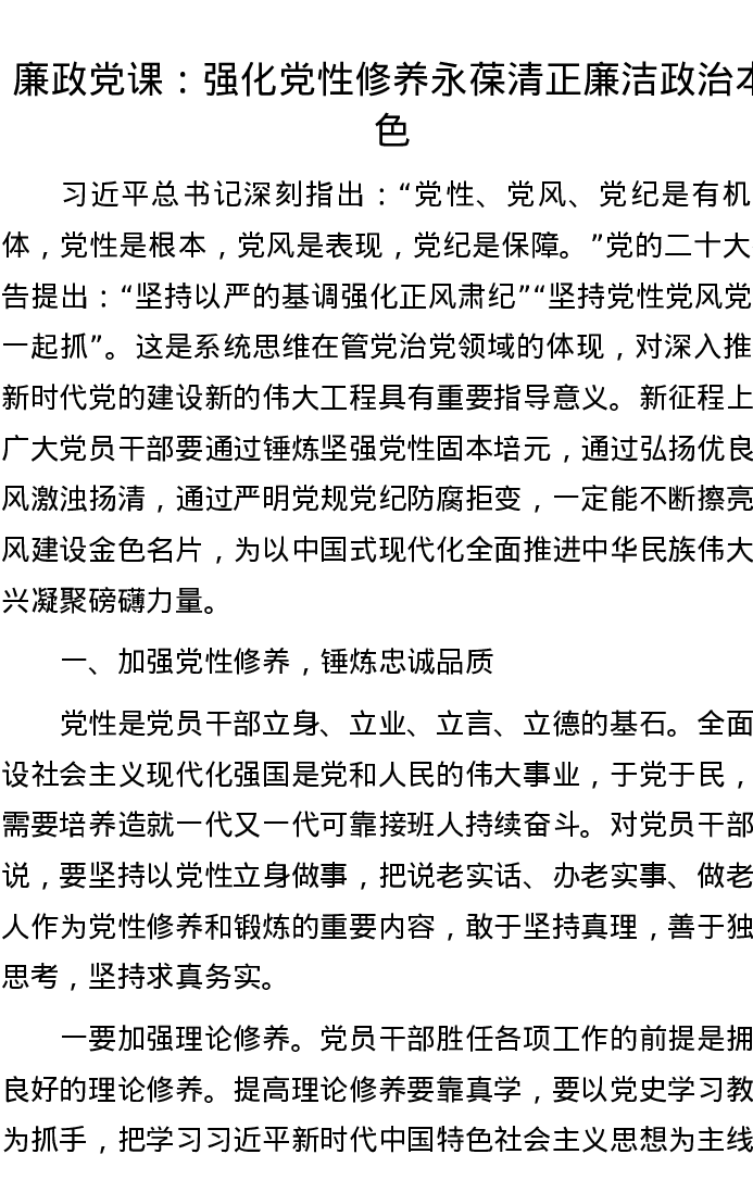 廉政党课:强化党性修养 永葆清正廉洁政治本色