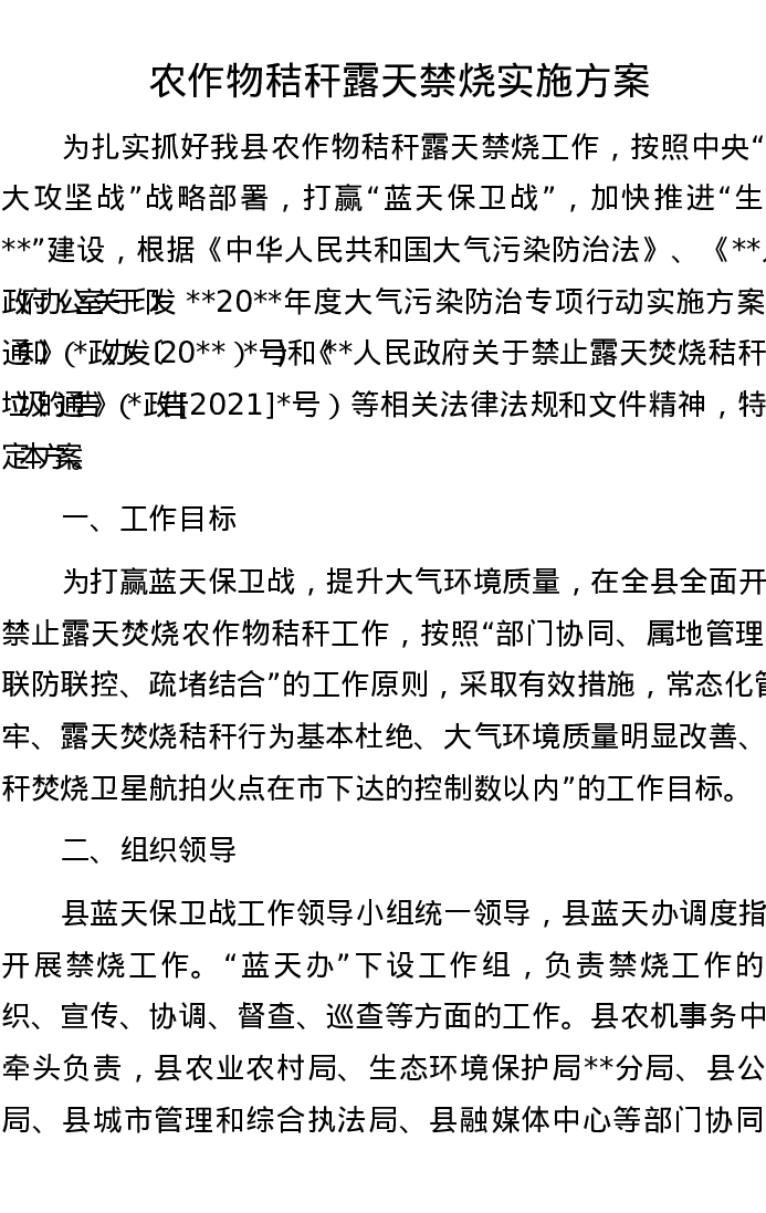 农作物秸秆露天禁烧实施方案