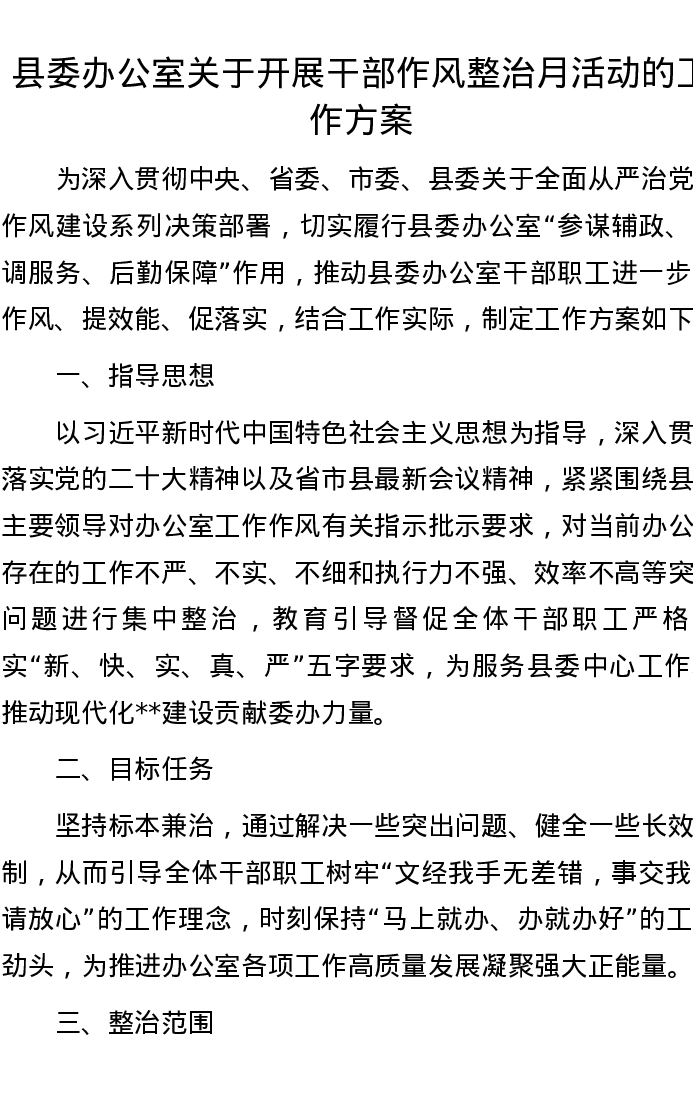 县委办公室关于开展干部作风整治月活动的工作方案