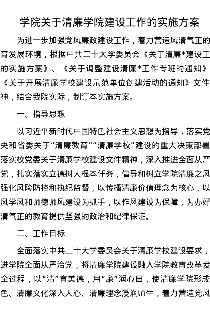 学院关于清廉学院建设工作的实施方案