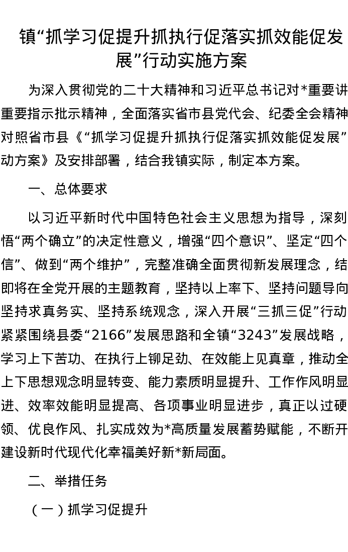镇“抓学习促提升抓执行促落实抓效能促发展”行动实施方案