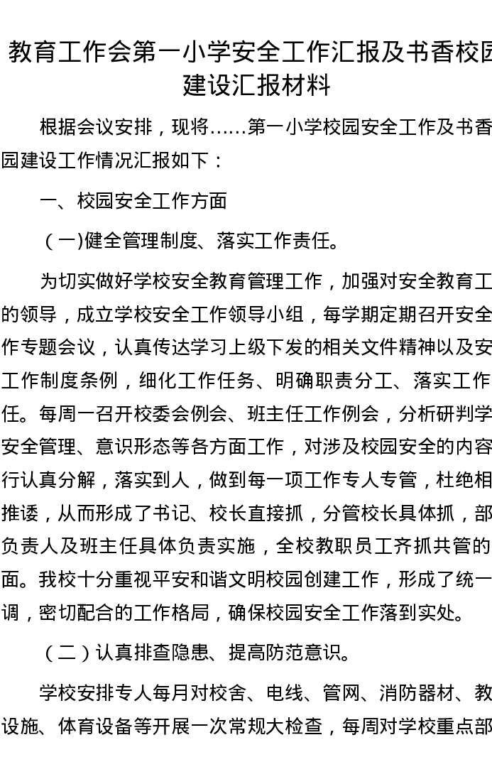 教育工作会第一小学安全工作汇报及书香校园建设汇报材料