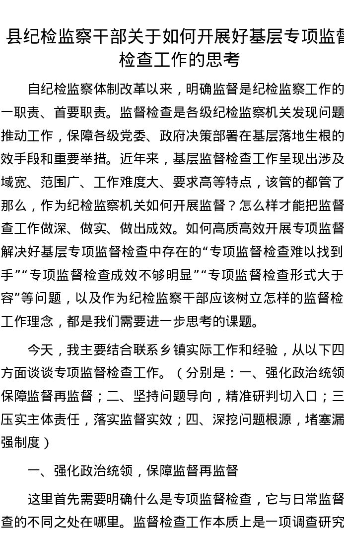 县纪检监察干部关于如何开展好基层专项监督检查工作的思考