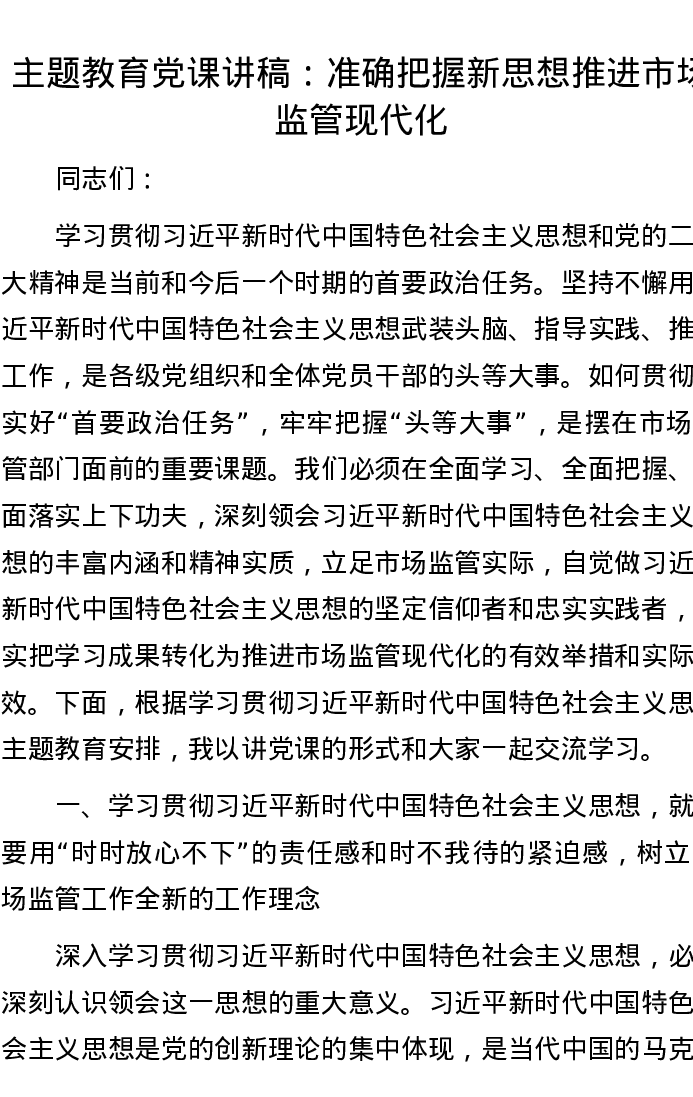 主题教育党课讲稿:准确把握新思想 推进市场监管现代化