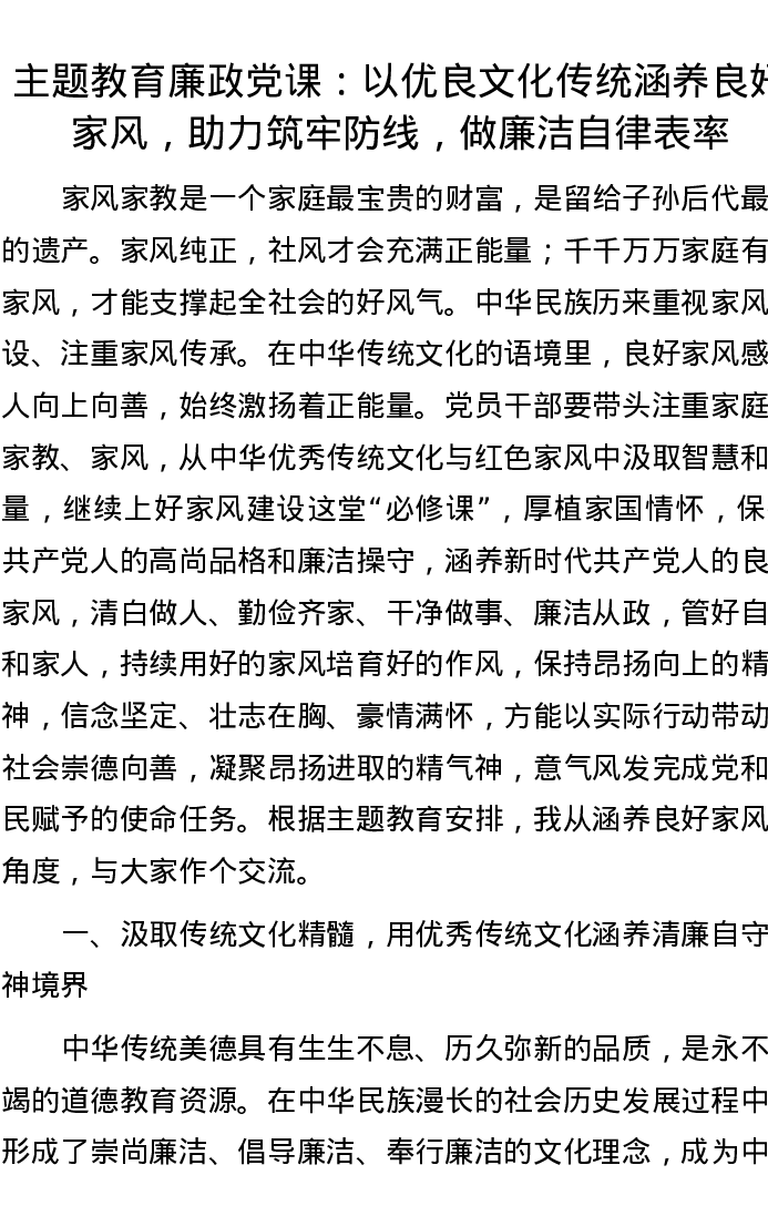 主题教育廉政党课:以优良文化传统涵养良好家风,助力筑牢防线,做廉洁自律表率