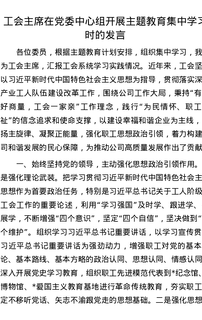 工会主席在党委中心组开展主题教育集中学习时的发言