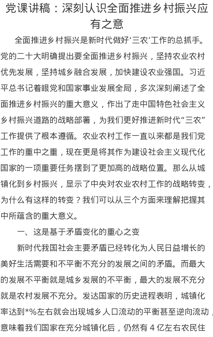 党课讲稿:深刻认识全面推进乡村振兴应有之意