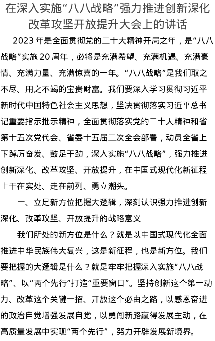 在深入实施“八八战略”强力推进创新深化改革攻坚开放提升大会上的讲话